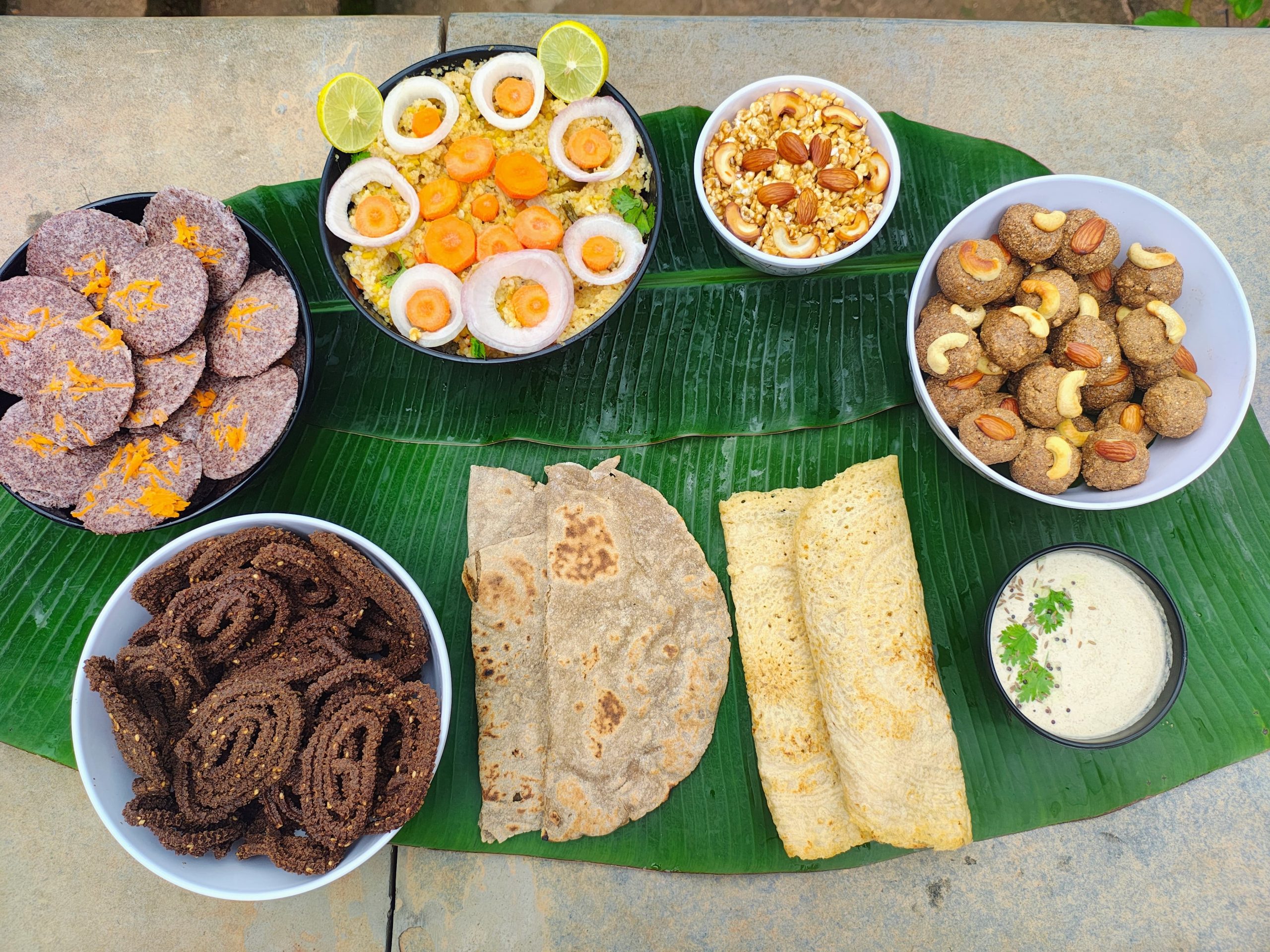 A millet-based ‘poshana thali’ or nutrition plate, comprising food items like ragi idlis and laddoos