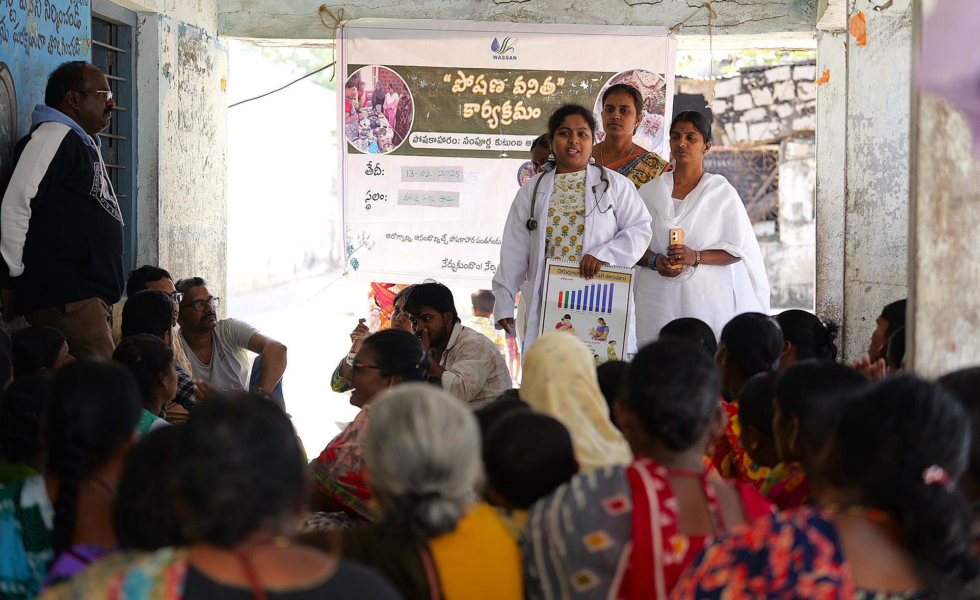 Community health workers and PHC doctors explaining the value of diversified nutrient-dense meals at a village community meeting